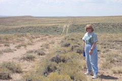 Kathy alongside the wagon ruts of emigrant pioneers on the Oregon Trail, South Pass, Wyoming |