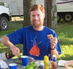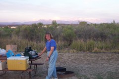 Kathy cooking dinner at KOA camp site, Cortez, CO