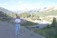 Kathy among the mountains along the Million Dollar Highway between Ouray and Silverton, CO